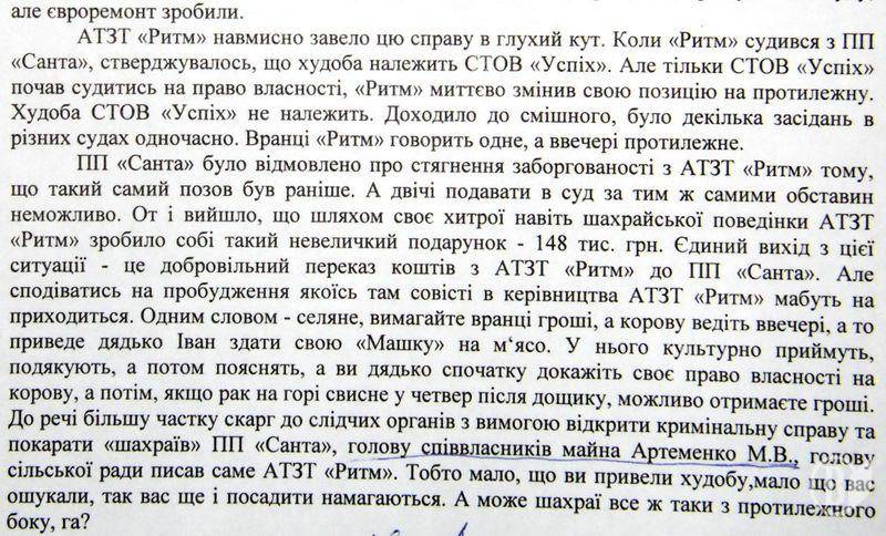 - прокуратура м. Чернігова провела перевірку та надала відповідь, що в діях ПП «Санта», голови сільської ради та голови співвласників майна ознак злочину не вбачаєтсья;