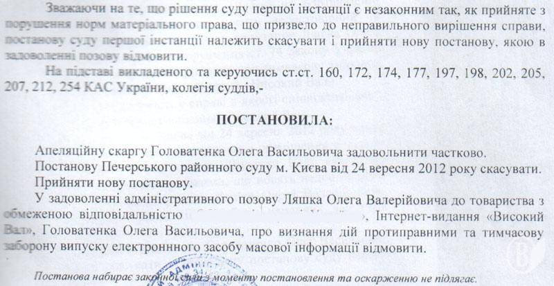 Київський Апеляційний адміністративний суд відмовив 28-го вересня у задоволенні позову Олега Ляшка до Інтернет-видання "Високий Вал”, а саме до власника сервера і хостінг-провайдера.