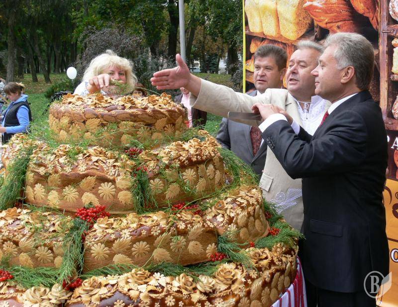 На фото: отакий коровай від «Київхліба» презентували на День міста – 2011 міський голова разом з головою наглядової ради «Хліба Києва» Владиславом Атрошенком