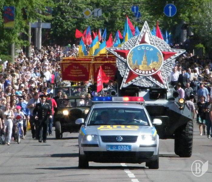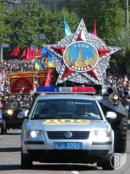 Щоправда, першим йшов легковик з великими літерами «ДПС» на капоті та стилізованою літерою «W» на решітці радіатора. Це одне авто псувало переможний вигляд усієї колони. Важко уявити більш ідеологічно недоречну машину на цьому святі, та ще й на чолі колони. Адже це – розкішний (за нашими мірками) «Volkswagen Passat» виробництва… переможеної Німеччини.