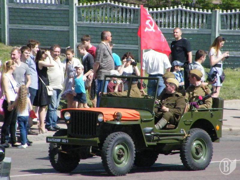 Від Красної площі (знову ж таки, традиційно) до Меморіалу Слави на Болдиній горі рушила механізована колона, яка складалася з радянського БТР, трьох військових джипів часів війни (один з них – знаменитий американський «Willys») та радянських відкритих УАЗиків.