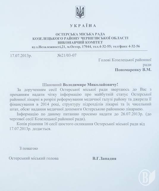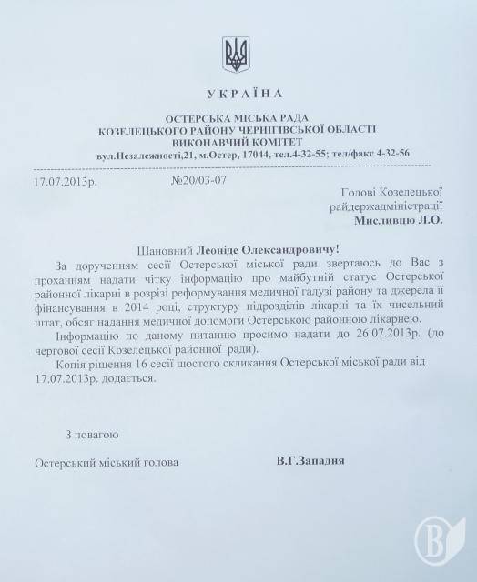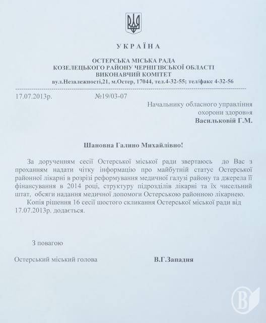 Депутати остерської міськради у своєму листі від 17-го липня просять обласне управління охорони здоров’я дати чіткі пояснення щодо долі лікарні і її фінансування на наступний 2014 рік (див. фото). Лист того ж змісту був спрямований головам Козелецької райради і Козелецької райдержадміністрації. Адже лише сесія райради може прийняти рішення про закриття медичного закладу.