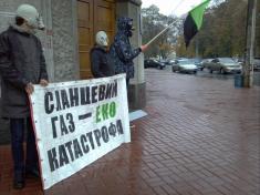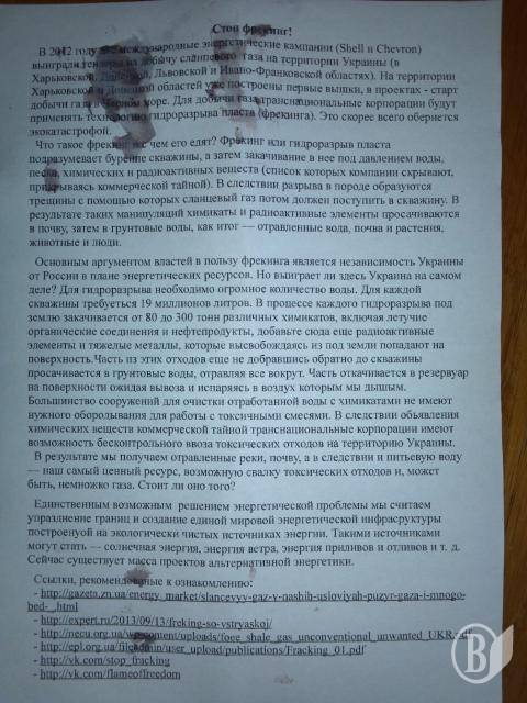 У листівках, як розповсюджували активісти, записано, що внаслідок розриву в породі утворюються тріщини, з допомогою яких сланцевий газ потім повинен надійти в свердловину.
