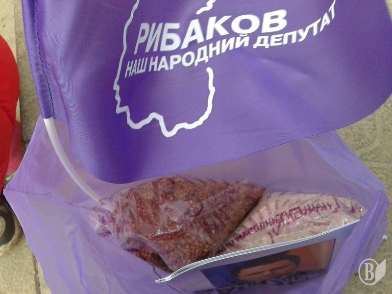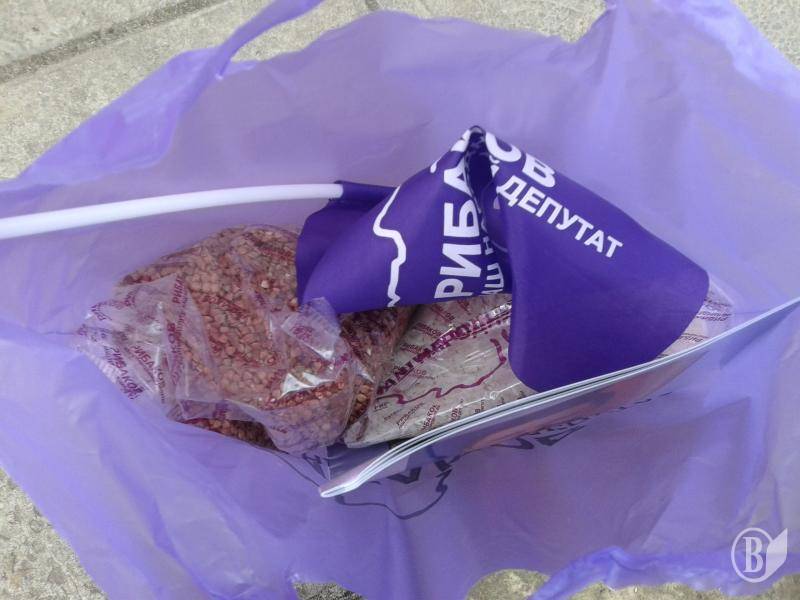Каждый участник и приглашенный на концерт получили щедрый подарок от депутата в виде продуктового набора: 0,5 кг гречки, 0,5 кг риса, брошурка и флажок с символикой Рыбакова – это все также было в его «именном» пакетике.
