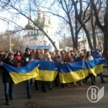 Студенты-митингующие, держа желто голубые стяги, неоднократно кричали «Слава Украине» и «Героям слава». В руках они держали собственноручно сделанные плакаты с призывами не быть в стороне и творить историю своей страны вместе.