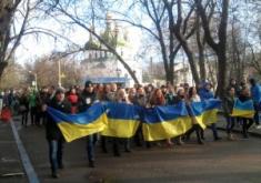Студенты-митингующие, держа желто голубые стяги, неоднократно кричали «Слава Украине» и «Героям слава». В руках они держали собственноручно сделанные плакаты с призывами не быть в стороне и творить историю своей страны вместе.