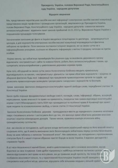 Ми, представники чернігівських засобів масової інформації і електронних засобів масової комунікації, представники медіа-профспілок і громадських організацій, звертаємося до Президента України, голови Верховної Ради, Конституційного суду України, народних депутатів з вимогою визнати антиконституційними і відмінити пакет законів прийнятий 16.01.2014 р. Верховною Радою України з порушенням процедури голосування .