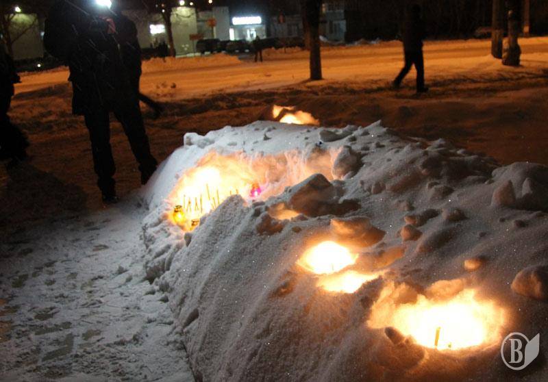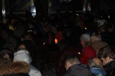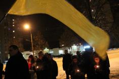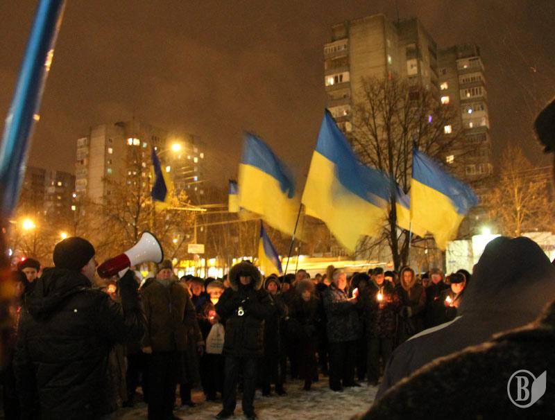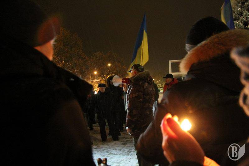 Протестующие держали в руках свечи памяти по погибшим в столицы и государственные флаги Украины.