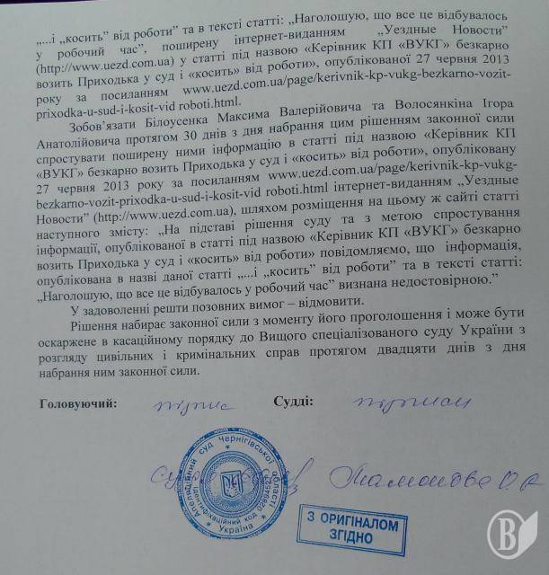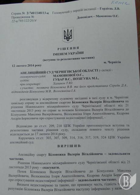 Я прочитала решение суда, где четко указано (цитата из решения): «Визнати недостовірною та такою, що принижує честь, гідність та ділову репутацію Білоножка Валерія Віталійовича наступну інформацію: у назві статті „... і косить від роботи“ та в тексті „Наголошую, що все це відбувалось у робочий час“, поширену інтернет-виданням „Уездные новости“... Зобов»язати Білоусенка Максима Валерійовича та Волосянкіна Ігора Анатолійовича протягом 30 днів з дня набрання цим рішенням законної сили спростувати поширену ними інформацію у статті..." И что здесь непонятно написано? Как это еще можно читать? Игорь, к сожалению читать «что говорят», как ты мне советуешь, я не умею, могу только слышать, и тот бред, что вы с Билоусенко наговорили изданию «Высокий вал» я слышала, ничего умного, на те же грабли. Теперь, я так понимаю, очередь Пучки и Хоменко подавать в суд.