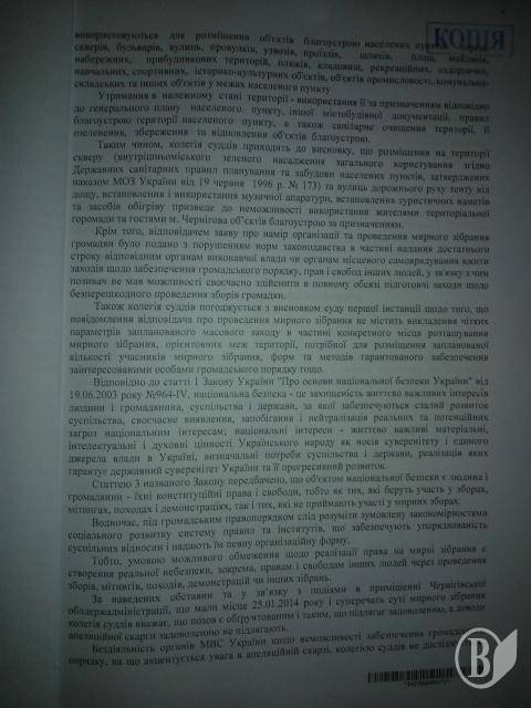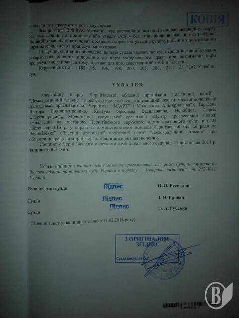 Київський апеляційний суд не задовільнив апеляцію Чернігівського ДемАльянсу на постанову Чернігівського окружного адміністративного суду від 23 листопада 2013 року у справі за адміністративним позовом Чернігівської міської ради до ДемАльянсу про обмеження права на мирні зібрання в сквері Попудренка.