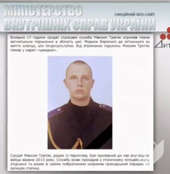 20-річний житель Чернігова, який проходив строкову службу у Внутрішніх військах України, загинув учора, 18 лютого під час протистояння у Києві.