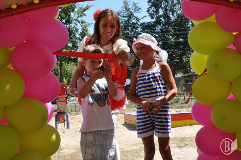 Саме дітям розбудовувати Україну. Приємно було спостерігати, як упевнено перерізували червону стрічку на новому дитмайданчику юні мешканці прилуцьких Сорочинців Даша Нетребко і Женя Салко.