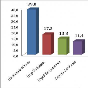 (На діаграмі вказано і відсотки «рейтингу» цих кандидатів: Рибаков — 17,5; Євтушенко —13,8; Сергієнко — 11,4