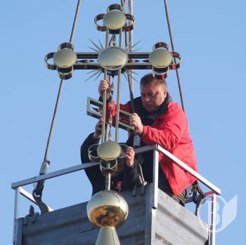 А еще утром, когда купольний крест стоял на земле, змитнивские подростки спорили - из настоящего золота крест или только хорошо полированый, что аж солнечные зайчики пускает.
