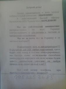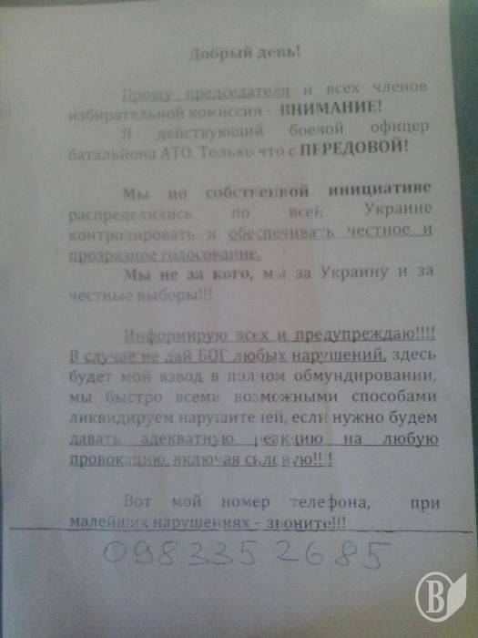 Також у листівці, яку невідомий мовчки залишив на столі членів виборчої комісії № 740987, активіст попереджає, що у разі виявлення порушень сюди приїде взвод у повному екіпіруванні.