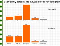 То ж найцікавіше те, що серед 500 опитуваних майже однакова кількість і студентів, і викладачів вважають, що у хабарництві обидві сторони винні однаково.