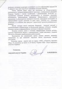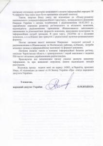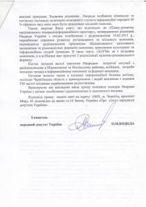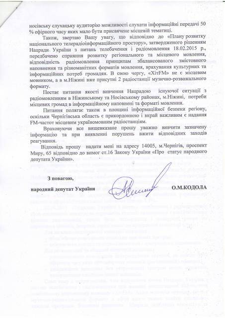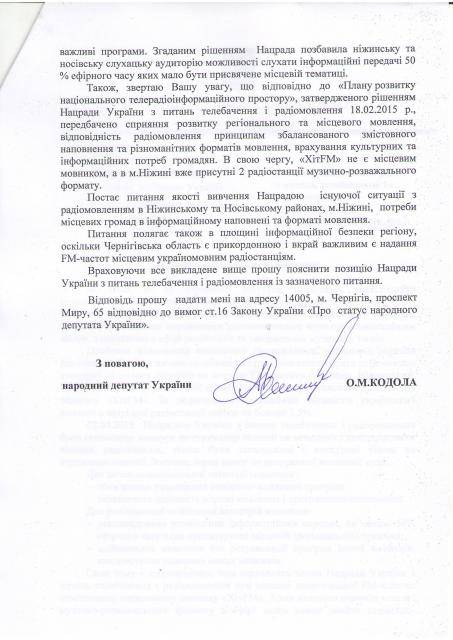 Як зазначається у депутатському зверненні, в оголошеному Нацрадою України з питань телебачення і радіомовлення конкурсі на отримання ліцензії на мовлення з використанням вільних радіоканалів, серед умов була рекомендація щодо розміщення інформаційних передач, не менше 50% ефірного часу яких присвячувати місцевій (регіональній) тематиці. Однак, не зважаючи на це, Нацрада позбавила ніжинську та носівську слухацьку аудиторію можливості слухати інформаційні передачі місцевої тематики. І це при тому, що відповідно до «Плану розвитку національного телерадіоінформаційного простору», затвердженого рішенням Нацради України з питань телебачення і радіомовлення 18.02.2015 р., передбачено сприяння саме розвитку регіонального та місцевого мовлення.