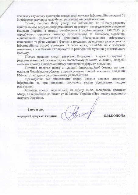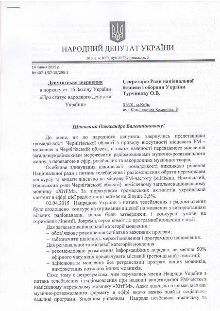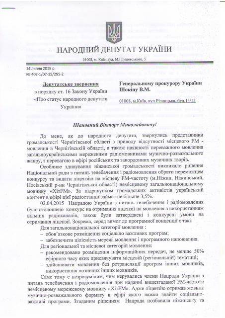 «До мене, як до народного депутата, звернулись представники громадськості Чернігівської області, зокрема Ніжина, з приводу відсутності місцевого FM-мовлення в області, а також наявності переважного мовлення загальноукраїнськими мережевими радіомовниками музично-розважального жанру, з перевагою в ефірі російських та закордонних музичних творів.