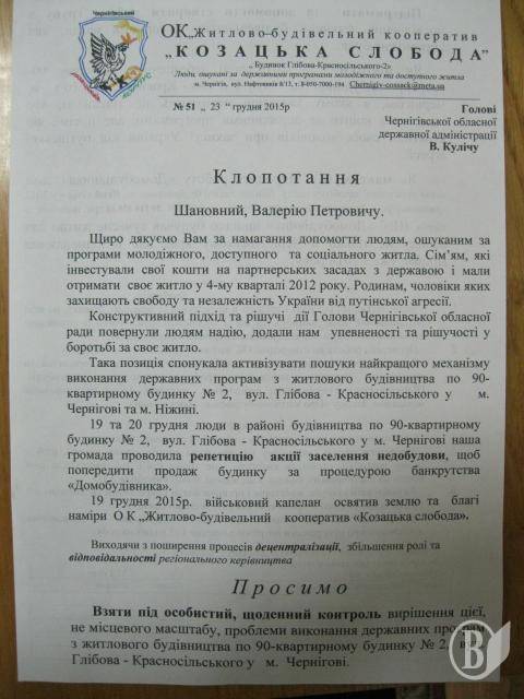 «На вас последняя надежда: нам жить негде. Возьмите под личный контроль решение этой проблемы. Есть инвестор, который хочет достроить. Помогите, у вас в руках есть все для этого. Иначе, мы в канун Нового года просто заселимся в 6-этажный недостроенный дом на Масанах, выведем «буржуйки» в окна и будем жить», - заявили активисты В. Куличу и областному депутатскому корпусу еще на сессии.