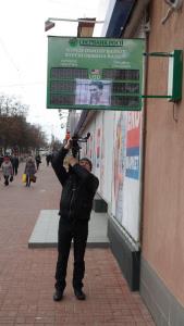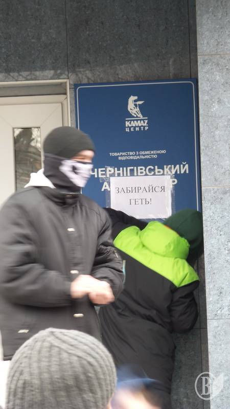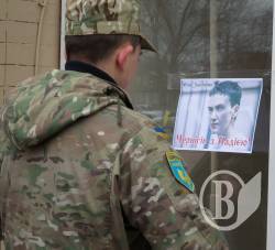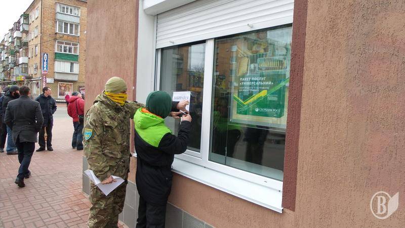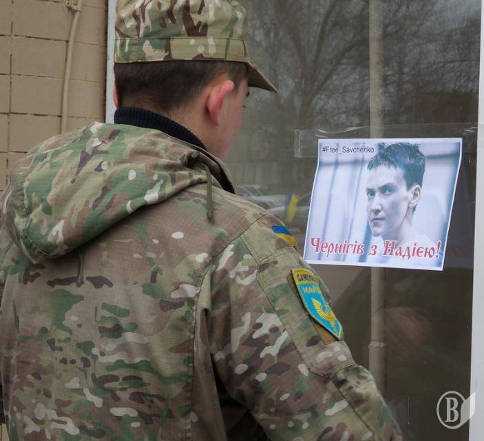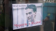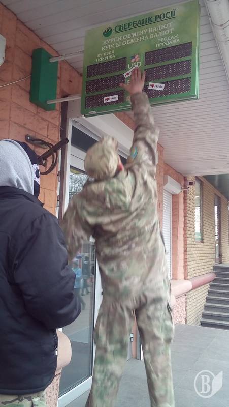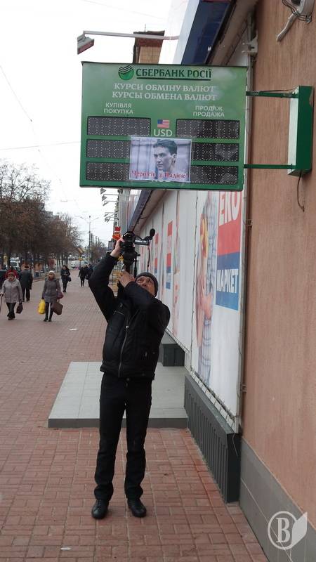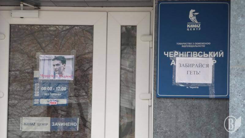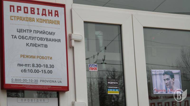 Портреты Надежды Савченко и требования "убираться прочь" появились на дверях страховой компании "Ведущая" (активисты связывают ее с русской страховой компанией), бывшего КСК, представительства КАМАЗа, центра продажи Газелей и Сбербанка России.