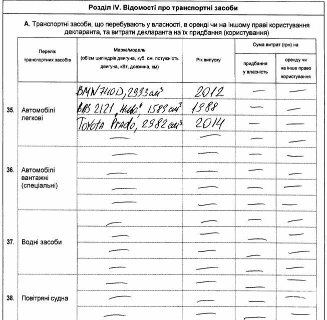 В нынешней декларации за 2015 год головы Черниговской ОГА Валерия Кулича указано, что он владелец двух легковых автомобилей – BMW 740, Toyota Prado и одного изделия ВАЗа – имеет ВАЗ 2121 «Нива».