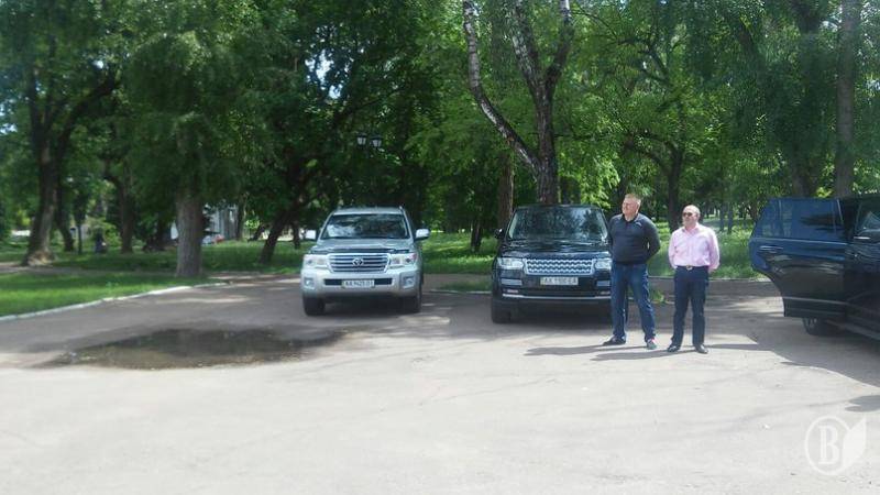 Перед приміщенням Колегіуму, на території охоронної зони, припаркувалися одразу декілька авто представницького класу: чорний Range Rover, на якому приїхав Фельдман та сріблястий позашляховик Toyota із київськими номерами АА 9425 ОТ.