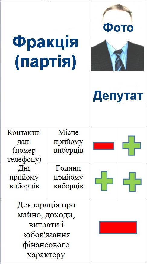 Например, на страницах депутатов фракции Радикальной партии Ляшко ни у одного из них нет информации о днях и часах приема граждан, а депутатские фракции «Укропа» и «Оппозиционного блока» не считают необходимым обнародовать эту информацию и только на странице одного депутата фракции «ОБ» Ковальчук Татьяны Николаевны содержится контактный номер телефона, а также отмечено место приема избирателей, в свою очередь на странице депутата фракции «УКРОП» Хасенко Олег Николаевича указан только номер контактного телефона.