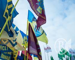 Серед них двійко-трійко державних, але сфотографувати не виходить, бо їх закривають інші. І скільки не відходь від натовпу – усі прапори все одно не влізають в кадр – так їх багато.