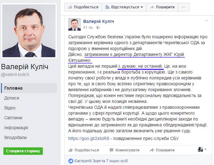 Про це він сказав, тобто написав, коментуючи сьогоднішнє затримання директора департаменту ЖКГ Чернігівської ОДА Юрія Євтушенка.