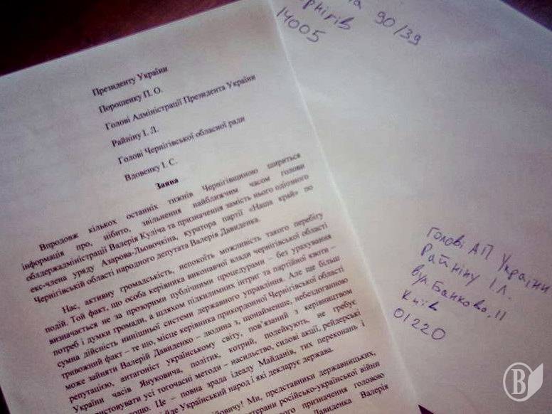 Заява направляється Президенту України Порошенку П. О., голові Адміністрації Президента України Райніну І. Л., голові Чернігівської обласної ради Вдовенку І. С.