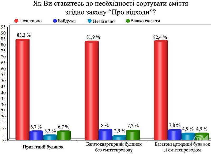 З іншого боку, понад 82% жителів Чернігова позитивно сприймають вимоги законодавства щодо сортування побутових відходів. І лише менше 4% ставляться до цього негативно.