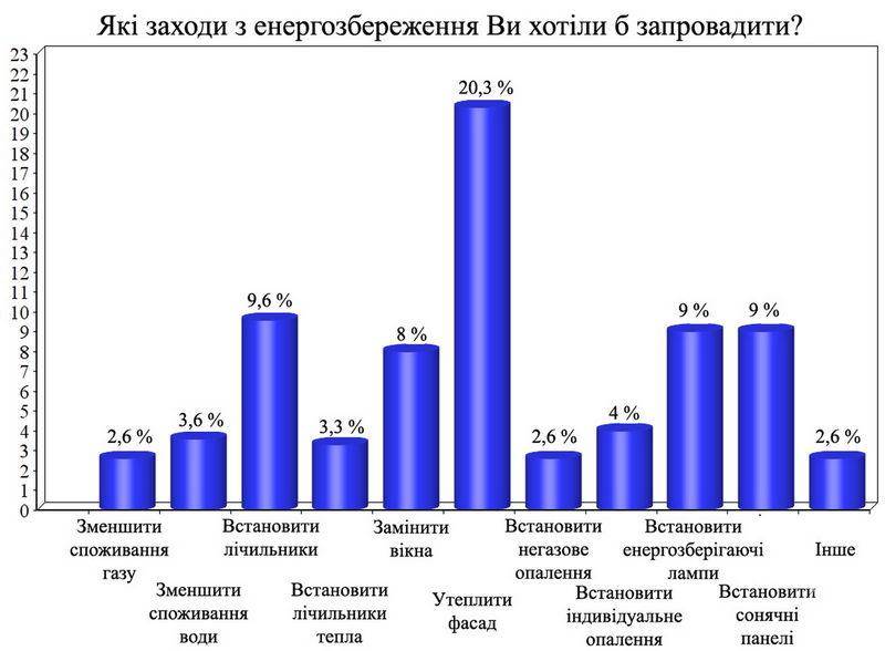 Окрім сортування, у чернігівців поцікавилися, які заходи з енергозбереження вони б хотіли запровадити? П’ята частина опитаних назвала утеплення фасадів. Серед інших заходів – встановлення лічильників, використання енергозберігаючих ламп та сонячних панелей, заміна вікон, зменшення споживання води та газу, встановлення негазового або індивідуального опалювання та інші.