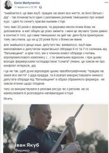 Виявилося, Якуб Іван Миколайович є депутатом чернігівської облради VI та VII скликань від "Батьківщини". А крім того, він є членом комісії облради з питань агропромислового комплексу (...) та земельних відносин. І при цьому володіє фермерським господарством «Соната».