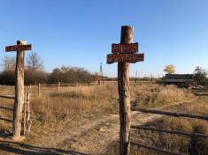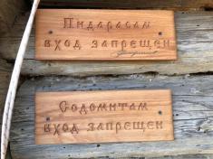 Село стало більше схоже на лісове поселення із російського фільму “Охота на пиранью”: дерев’яний частокіл, хрести, таблички з нецензурними написами російською мовою.