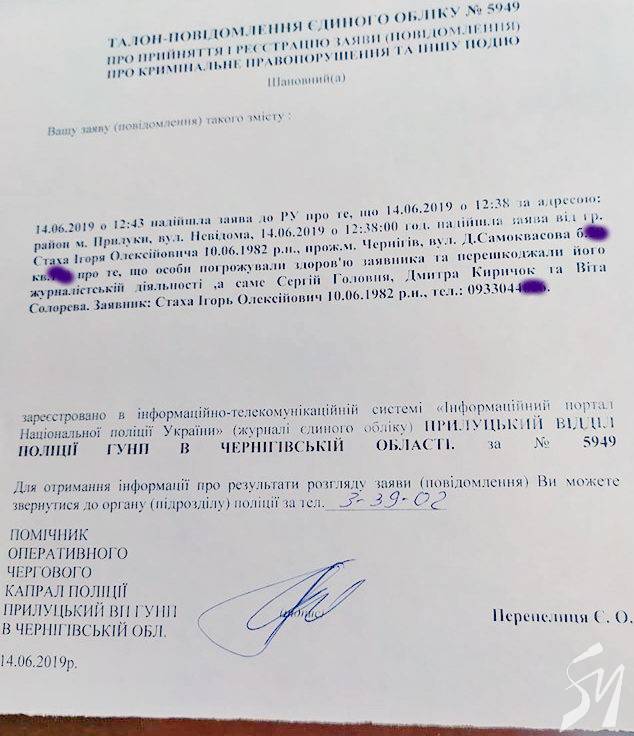 «Прийшов у прилуцьку поліцію писати заяву про погрози, – повідомив Ігор Стах у Facebook. – 4 випадки менш, ніж за добу, занадто».
