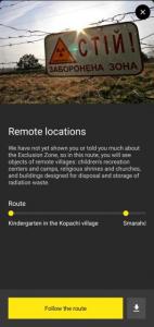 Усі ці функції активуються при проходженні маршруту та роблять подорож неймовірно цікавою. До уваги мандрівників представлено 7 маршрутів та 44 локацій, кожна з яких заслуговує окремої уваги і має унікальну історію. Інформація розміщена двома мовами, українською та англійською, тому будь-хто зможе скористатися цією функцією та сформувати власний досвід відвідування Чорнобилю.