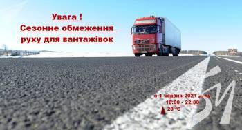 З вівторка, 1 червня, діятиме літнє обмеження руху для вантажівок. В період підвищення температури повітря понад 28°C на дорогах загального користування державного значення в межах області тимчасово обмежуватиметься рух вантажного транспорту вагою понад 24 тони та навантаженням на вісь більше ніж 7 тонн на період з 10:00 до 22:00 години.