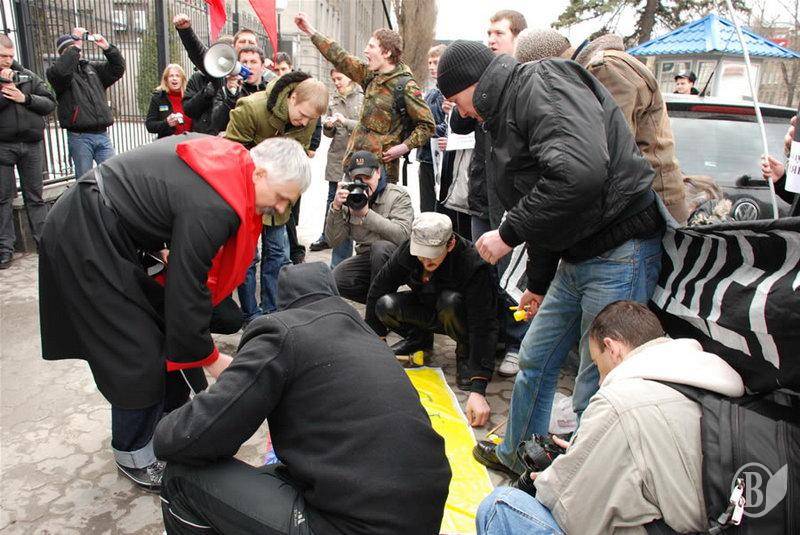 Вчера утром в знак протеста против «антинародной политики Кремля и репрессий русских патриотов десять активистов БРАТСТВА помочились на посольство Российской Федерации в Украине (просп. Воздухофлотский, 27)».