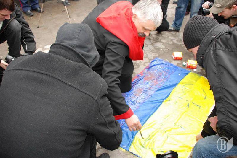 Возле входа в посольство активисты перекрасили «власовский флаг – флаг полицейского режима РФ», на желто-голубой – «флаг свободы».