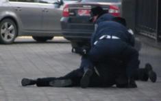 Не зрозуміло, за що хлопців почали по тротуару таскати і руки заламувати. Помочитися, як видно, явно не встигли. Та схоже й не збиралися. Що, на тротуарі біля російського паркану не можна мовчки спокійно стояти? :))