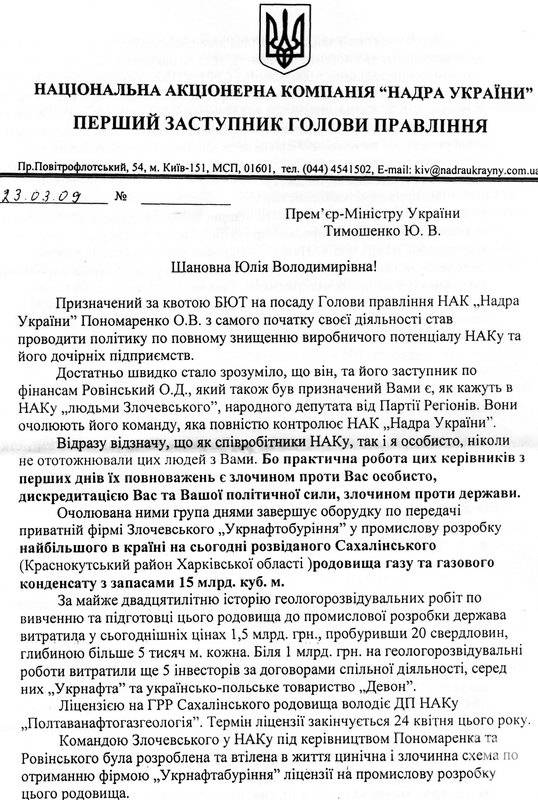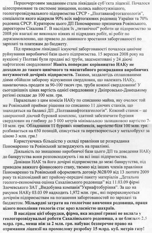 Як тільки мені ставало відомо про чергову оборудку Пономаренка та Ровінського по розкраданню та знищенню НАК „Надра України”, я миттєво намагався відреагувати та перешкодити їх злочинним діям. Неодноразово, зокрема 22.11.08 та 18.02.09, я направляв службові записки кожному члену правління, намагаючись завадити цьому. Проте моїх, та сил декількох інших членів правління, які намагалися цьому протидіяти, недостатньо для припинення такого відвертого знищення державної компанії „Надра України” та грабування надр держави, що належать українському народу.