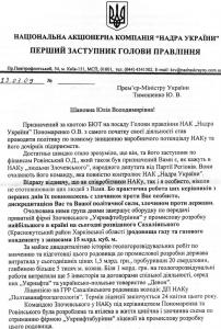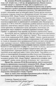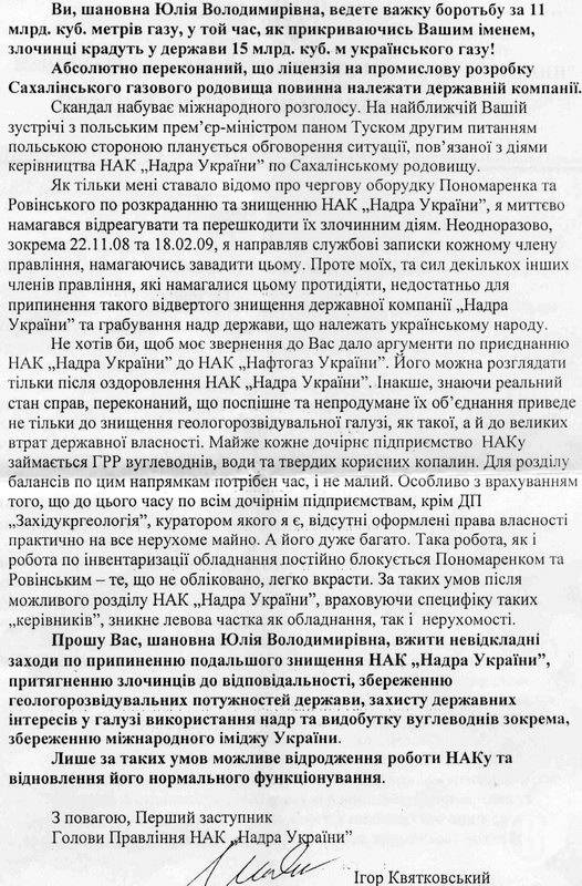 Прошу Вас, шановна Юлія Володимирівна, вжити невідкладні заходи по припиненню подальшого знищення НАК „Надра України”, притягненню злочинців до відповідальності, збереженню геологорозвідувальних потужностей держави, захисту державних інтересів у галузі використання надр та видобутку вуглеводнів зокрема, збереженню міжнародного іміджу України.