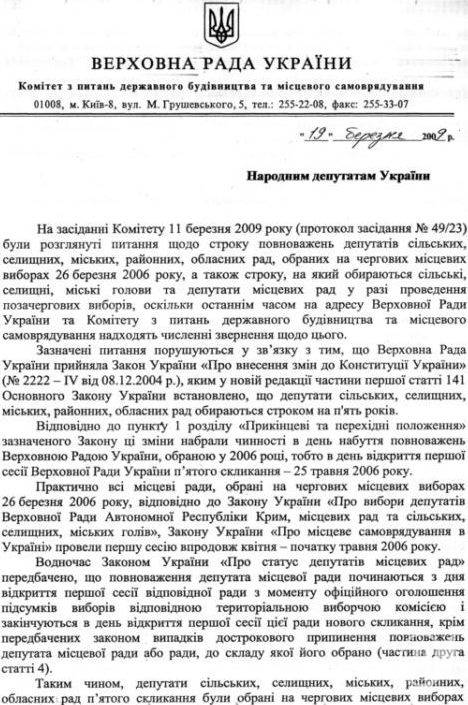 Відповідь шукаємо у висновках Комітету з питань державного будівництва та місцевого самоврядування від 19 березня 2009 року.