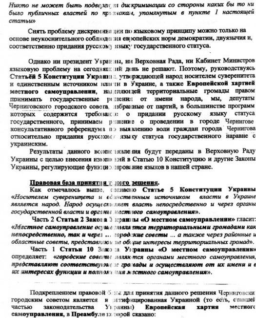 Автори проекту рішення заявляють, що сьогодні в Україні "здійснюється політика етноциду російського та російськомовного населення", оскільки в Україні російська мова не є державною і громадяни України і Чернігова зокрема стають людьми другого сорту – переконані представники названих фракцій.