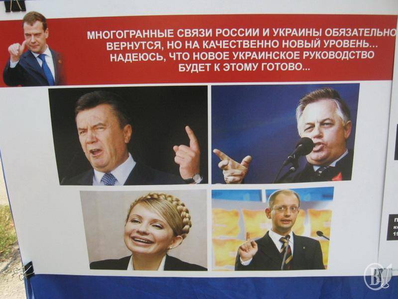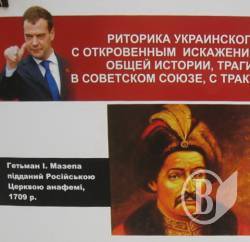На плакатах изображены претензии Медведева к Украине и украинцам, выраженные им в видеообращении, и фактическое состояние дел в украинско-русских взаимоотношениях. Материал иллюстрирован большим количеством исторических и актуальных фактов из московской внешней политики.