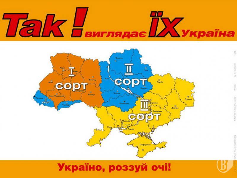 Раздел карты Украины на части известен нам еще с прошлых выборов Президента – в 2004 году. В виде открытки с Украиной, разделенной на сорта. Тогда некоторые политические силы связывали распространение открытки со штабом кандидата на должность Президента от Партии регионов.