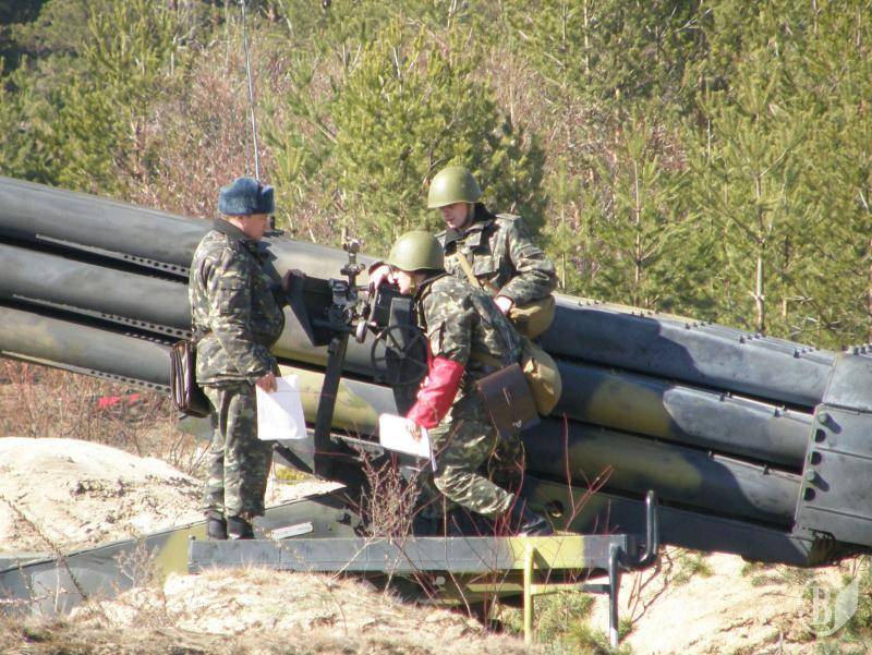 Офіцери 27-го Сумського реактивного артилерійського полку з екіпажами 7-ї батареї 3-го артдивізіону виконують залікові вогневі завдання з бойовою стрільбою з реактивних систем залпового вогню 9К57 «Ураган».