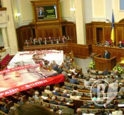 Ці фото я зробив у вівторок вранці в залі парламенту. Це відкриття сесії. Як бачимо, сесійний зал наполовину порожній: обидві опозиційні фракції — БЮТ і НУ-НС бойкотували відкриття сесії. Як заявила опозиція , через політичні переслідування їхніх лідерів. На своїх секторах розмістили величезні банери з портретами підсудних Тимошенко і Луценка. Словом, новий політичний сезон дійсно обіцяє бути гарячим.