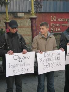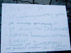 Наприкінці акції учасники на плакатах теж написали та сказали вголос, за що вони «дякують» Президентові: «Дякую за Міністра освіти – українофоба!», «Дякую за перекручену історію!», «Дякую за цензуру!».