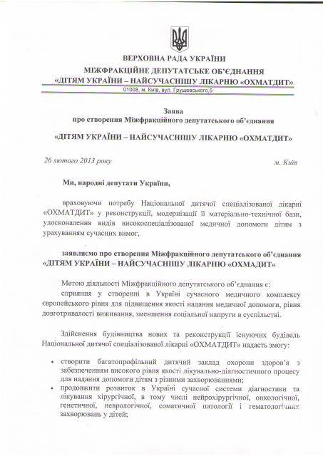 Вчора під час пленарного засідання, голова Верховної Ради Володимир Рибак оголосив про створення міжфракційного депутатського об’єднання «Дітям України – найсучаснішу лікарню «Охматдит», яке очолив народний депутат України, заступник голови Опікунської ради Національної дитячої спеціалізованої лікарні «ОХМАТДИТ» Валерій Дубіль.